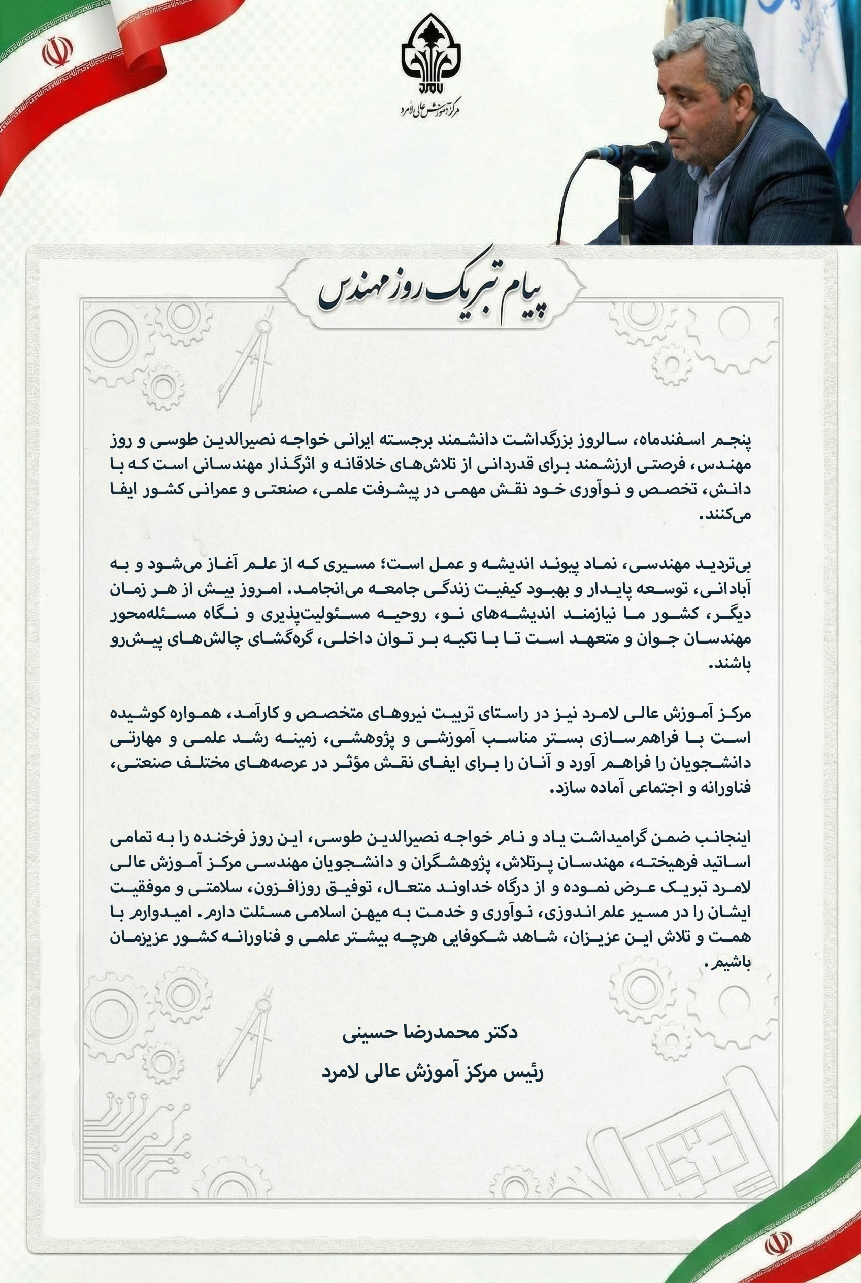 اینجانب ضمن گرامیداشت یاد و نام خواجه نصیرالدین طوسی، این روز فرخنده را به تمامی اساتید فرهیخته، مهندسان پرتلاش، پژوهشگران و دانشجویان مهندسی مرکز آموزش عالی لامرد تبریک عرض نموده و از درگاه خداوند متعال، توفیق روزافزون، سلامتی و موفقیت ایشان را در مسیر علماندوزی، نوآوری و خدمت به میهن اسلامی مسئلت دارم. امیدوارم با همت و تلاش این عزیزان، شاهد شکوفایی هرچه بیشتر علمی و فناورانه کشور عزیزمان باشیم.