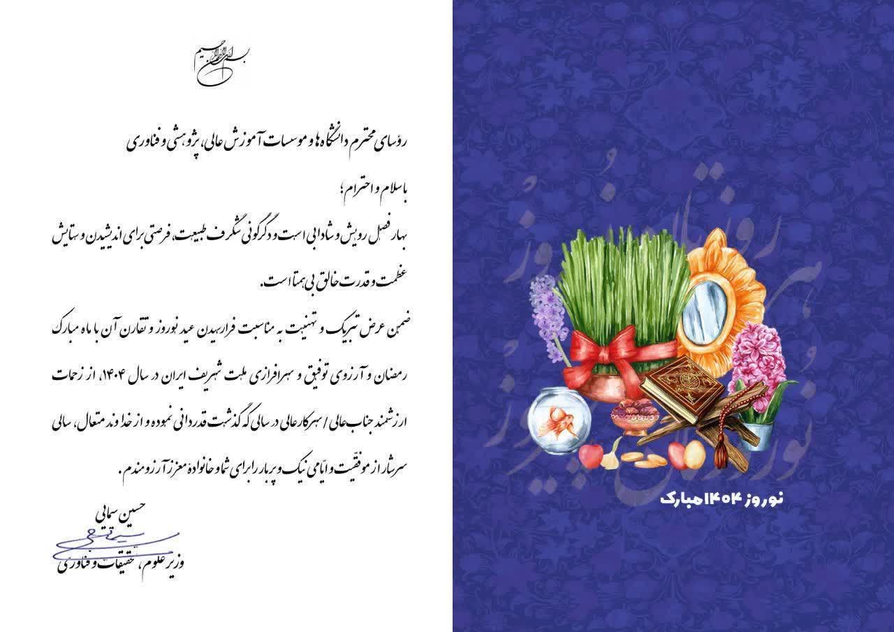 ضمن عرض تبریک و تهنیت به مناسبت فرارسیدن عید نوروز و تقارن آن با ماه‌ مبارک رمضان و آرزوی توفیق و سرافرازی ملت شریف ایران در سال ۱۴۰۴، از زحمات ارزشمند جناب‌عالی/سرکارعالی در سالی که گذشت قدردانی نموده و از خداوند متعال، سالی سرشار از موفقّیت و ایّامی نیک و پر بار را برای شما و خانوادۀ معزز آرزومندم.